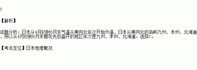 每年日本不同地区樱花开放日期各不相同。从4月初到6月末樱花先后盛开的地区依次是:( )