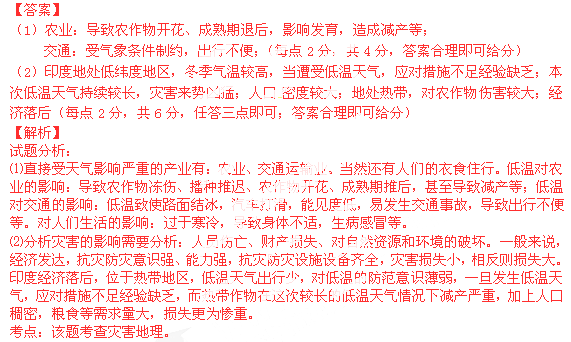 (2)分析低温天气给印度造成影响程度较大的原因。(6分)