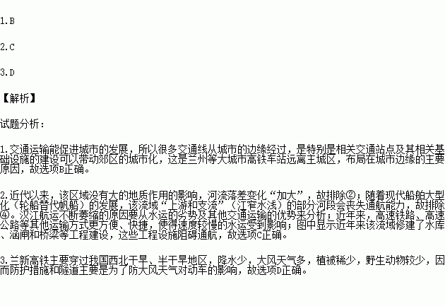 在我国进入“高铁时代“的大背景下,各城市的高铁站建设也方兴未艾,而部分河运却日益衰弱。2014年2月26日,中国首条在高原高海拔和戈壁荒漠地区开通的高速铁路——兰新高铁全线开通运营。汉江全长1532公里,流域涉及6省市。素有“千里黄金水道”之称。读图文材料,回答下列问题。