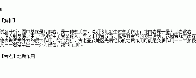 读某岛屿上东西方向延伸的地质、地形剖面图。古老基底地区先后经历的地质作用可能是( )