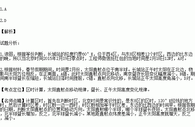 北京时间2015年2月19日零点钟声敲响时,某工程师在南极长城站参与了中央电视台春节联欢晚会微信抢红包活动。下图为长城站位置示意图。读图回答下列各题。