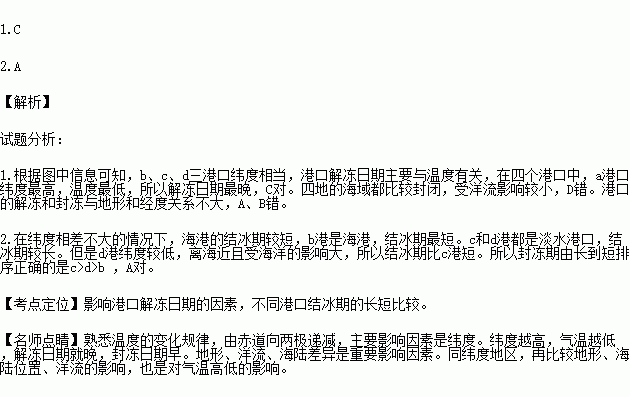 2. b、c、d三港口封冻期由长到短排序正确的是