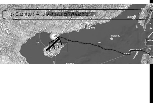 分析:此题考查台风的知识.台风,是热带气旋强烈发展的一种特殊形式,位于热带,产生于洋面上,中心附近风力12级及以上.台风带来狂风、暴雨和风暴潮.台风登陆时,海口在台风的南侧,根据低压的气流运动方向判断海口的风向是西南风.