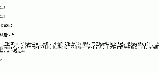 C.丙地向斜成谷 D.丙、丁之间有断层
