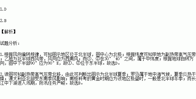 C. 乙地盛行风向为东南风 D. ①、② 位于中纬度、东半球