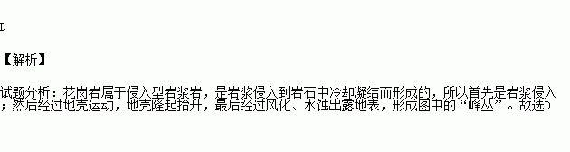 安徽天柱山属花岗岩峰丛地貌(如下图所示),地质遗迹丰富,被联合国教科文组织批准为世界地质公园。图中“峰丛”形成过程的先后顺序为( )