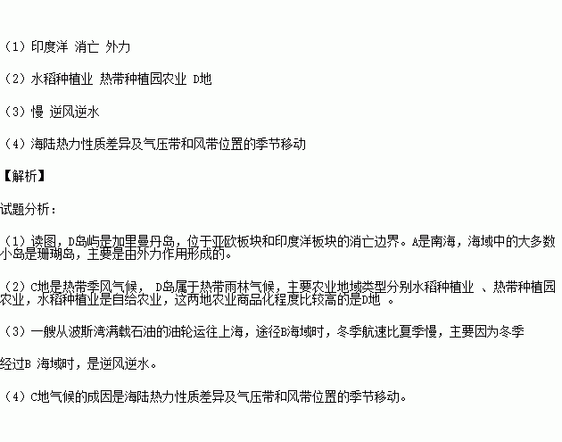 (2)C地、D岛主要农业地域类型分别是 、 ,这两地农业商品化程度