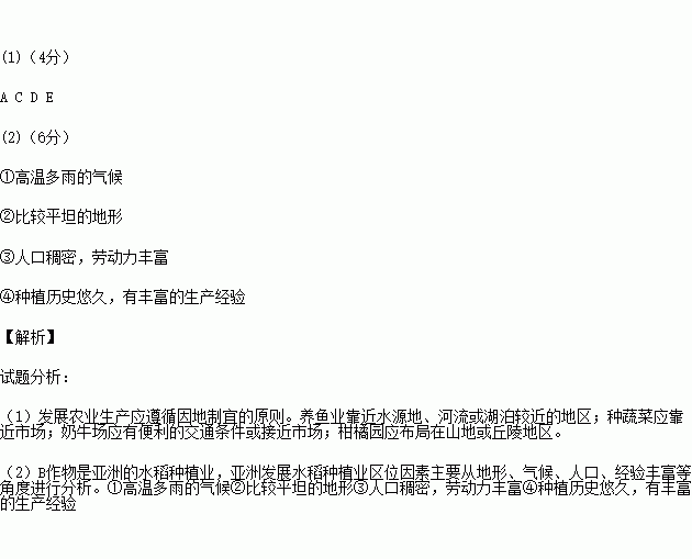 (1)请你根据影响农业区位因素进行布局,选择合理的字母填在横线上。(4分)
