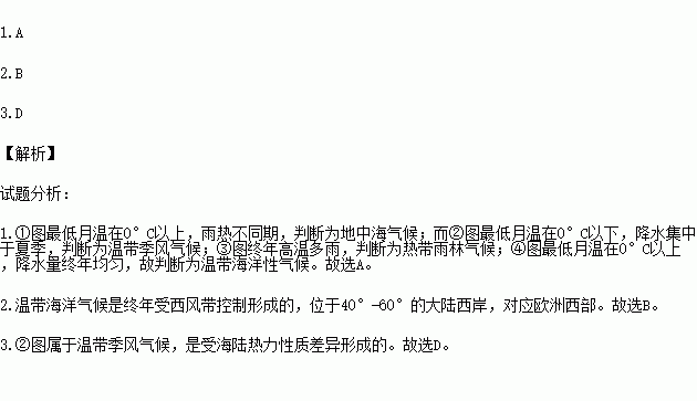 1.上面四幅图分别代表一种气候类型,哪幅图代表地中海气候