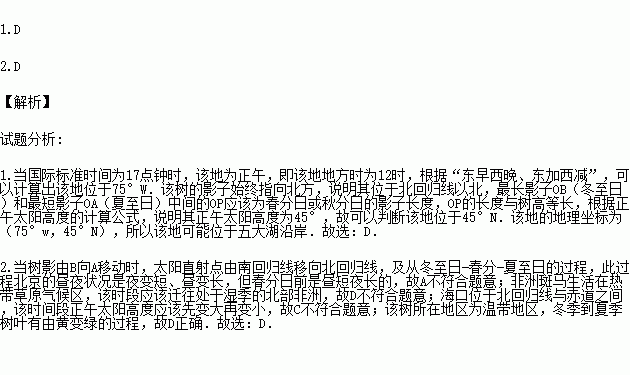 某兴趣小组每天在国际标准时间为17点钟时,测得一年中该树正午影子顶端在AB之间来回移动,树高为4米,OP为4米,P点为AB中点。读图完成下列各题。