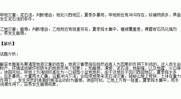 读图,分别判断最可能影响甲、乙两地的不同地质灾害类型并说明理由。