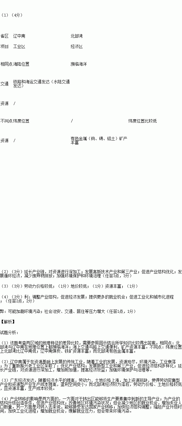 (1)从地理位置、交通和资源的角度,比较辽中南工业和北部湾经济区发展条件的异同点。(4分)