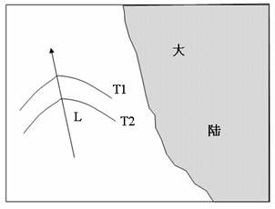 (2)在图示海域画两条过洋流L的等温线,分别标注T1和T2,其温度值关系为T1>T2,以示意该海域表层生活废水温度的分布规律。