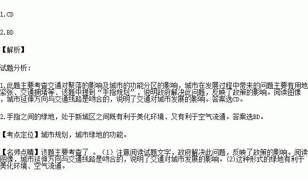 为解决老城区无序蔓延等问题,丹麦提出“手指规划”,即老城区为“掌心”,以新建城区为“手指”。据此,回答下列各题。