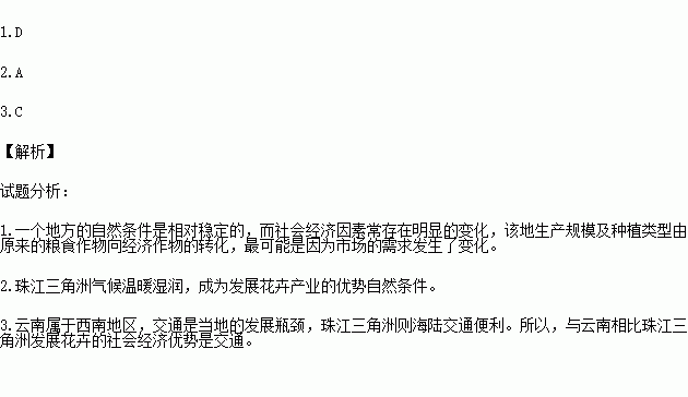 3.云南凭借自身的优势条件和我国农业产业结构调整、西部大开发的有利时机,已逐渐成为我国的花卉产业带。与云南相比珠江三角洲发展花卉的社会经济优势是