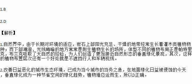 植物墙,是指充分利用不同的立地条件,选择攀援植物及其它植物栽植并依附或者铺贴于各种构筑物及其它空间结构上的绿化方式。毛毡式建筑垂直绿化由法国植物学家帕特里克·布兰克发明,他将体型较大的植物放置于植物墙的上方,体型较小的植物放置于植物墙的下方。该类型植物墙的最大特点是不需要土壤和种植基质,以管线方式传输水分和养料维持植物生长。读图完成下列各题。