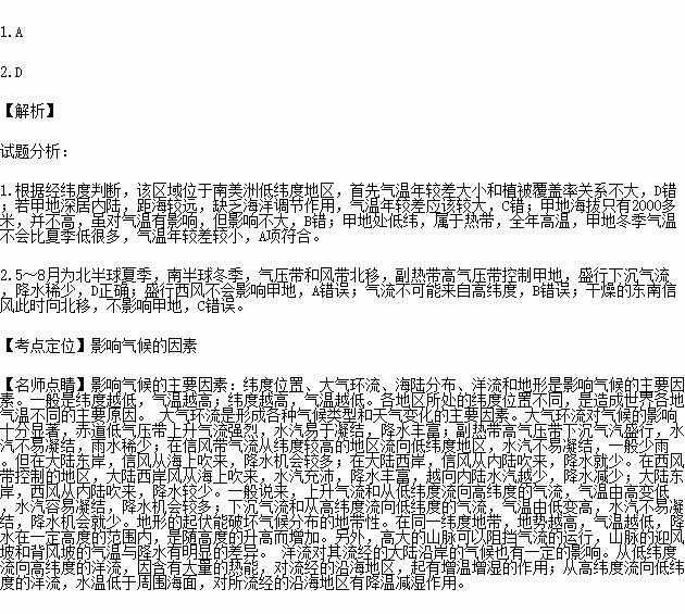 甲地(位置见图)气温年较差较小,5~8月降水稀少。据此完成下列问题。