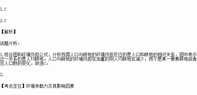 环境的承载能力是有限的,读“环境负担公式”和“我国人口与耕地变化图”,回答下列问题。