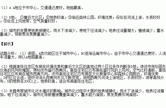(2)A、B、C、D四地中,高级住宅区应建在_______地,请说明理由。