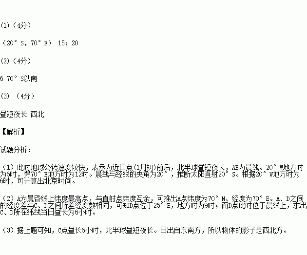 (3)北京昼夜长短状况是_______ _________,日出时物体影子朝向________。(4分)