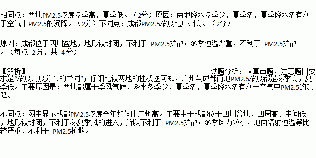 比较广州与成都PM2.5浓度月度分布的异同,并分析其自然原因。
