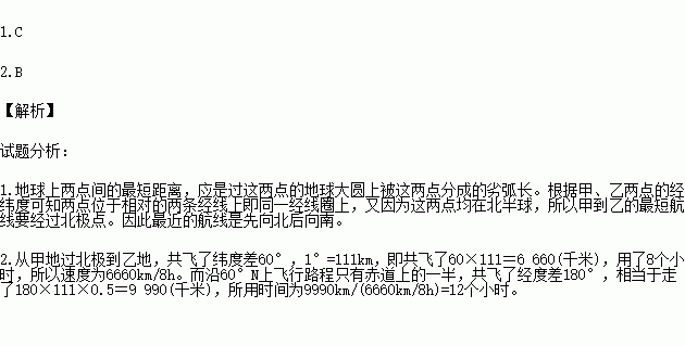 2.这架飞机若以同样的速度,沿60°N纬线飞行,抵达乙地大约需要