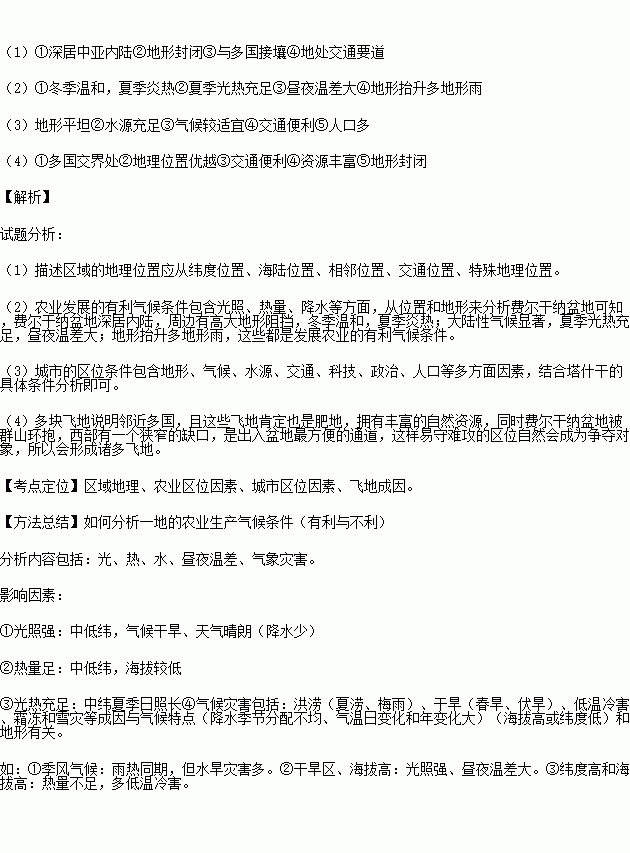 (2)结合位置和地形分析费尔干纳盆地农业发展的有利气候条件。(6分)