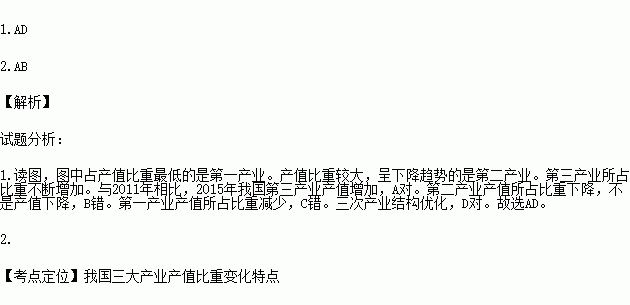 下图为我国2011-2015年三次产业比重和国民生产总值变化示意图。读图回答下列问题。