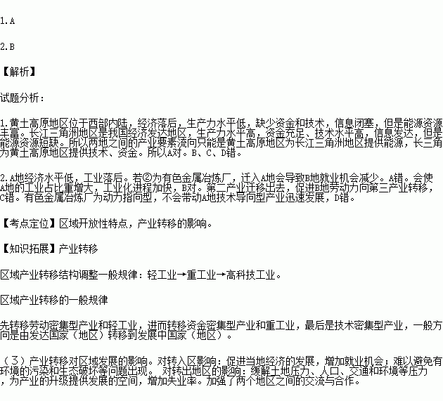1.若A、B分别是黄土高原与长江三角洲地区,①、②代表的产业要素在区际之间流向合理的是