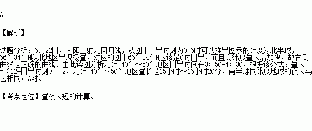 下图是某日同一经线日出时刻(地方时)随纬度变化图。图内三条曲线,其中一条是正确的。请阅读正确曲线。若图表示6月22日状况,则南纬40°~50°地区的夜长约为