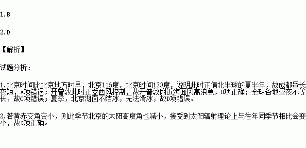 2.若黄赤交角变小,则此季节北京大气上界接受到太阳辐射理论上与往年同季节相比( )