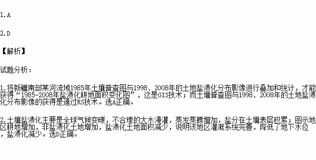 土壤盐渍化是指土壤底层的盐分随水分上升到地表,并在土壤表层积累的现象或过程。利用地理信息技术手段,将新疆南部某河流域1985年土壤普查图与1998、2008年的土地盐渍化分布影像进行叠加和统计,获得“1985-2008年盐渍化耕地面积变化图”,据此回答下题。