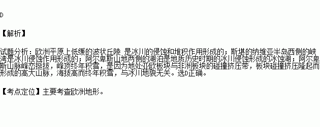 D.阿尔卑斯山脉峰峦挺拔,峰顶终年积雪