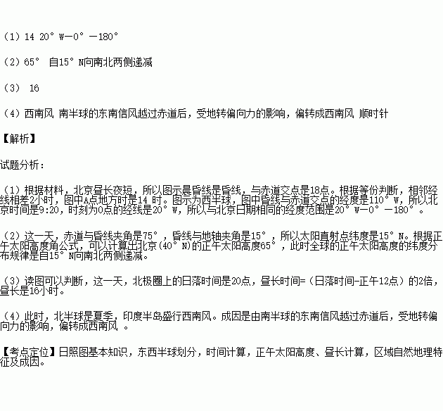 (2)这一天北京(40°N)的正午太阳高度是____,此时全球的正午太阳高度的纬度分布规律是________________________。