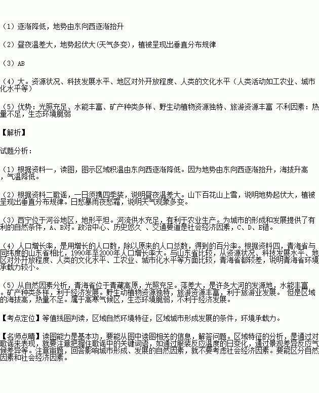 (4)根据资料四,青海省与同纬度的山东省相比,1990年至2000年人口增长率