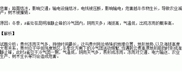 说出冻雨的主要危害,并从天气系统和地形两方面分析A省冻雨多发、持续时间最长的原因。