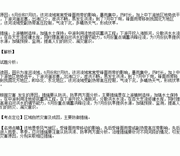 分析6、7月份该河流域的自然灾害常发生急转的原因,并提出具体的应对措施。