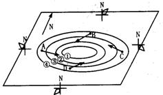 点拨:解此类题的关键是仔细审题,看清题目中给出的已知条件,尤其是图中的隐含信息。根据图中风频图可知, A处吹西北风的机率最大,由此首先可以断定A处的水平气压梯度力是从A指向图示气压系统的中心,因此气压值的排序是④>③>②>①,再由A处吹西北风这一点,可以判断出是向中心运动的气流向右偏转而形成的,再参照B、C、D点的风向进一步印证,可知此图表示的是北半球的低压(气旋)。本题从先另外的B、C、D中的任意一点出发进行判断也是同样的道理。