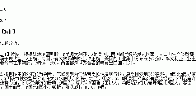 2.关于图中M、N两国阴影区气候空间分布范围差异的主要原因有
