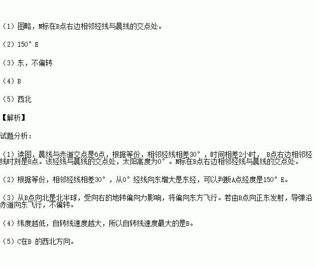 (1)在图中标出太阳高度为00、地方时为8时的地点M。