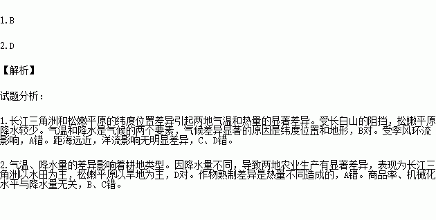 长江三角洲和松嫩平原都位于我国东部季风区,但两地气候具有明显的差异,并对农业生产产生显著影响。据此完成下列各题。