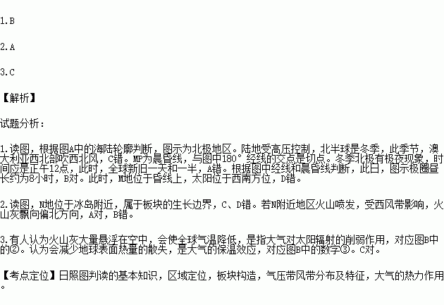2.若N附近地区火山喷发,下列关于“N附近地区所处板块边界类型,以及图A所示时刻火山灰飘散方向”的说法,正确的是