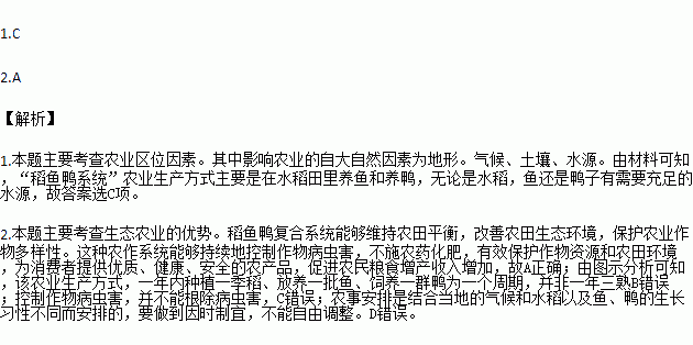 1.影响“稻鱼鸭系统”农业生产方式的主要自然条件是