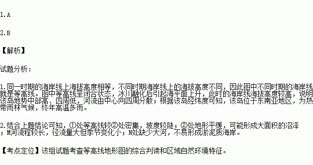 A.①处有该岛面积最大的沼泽 B.①处比②处坡度陡峭