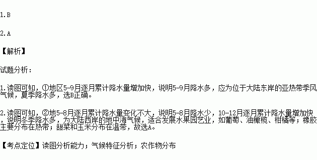 读北半球亚热带同纬度大陆东、西两岸沿海两地年降水量逐月累计曲线图, 回答下列问题。