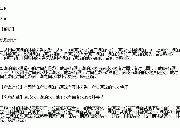 D.时间点③比时间点①河、湖之间水体补给更快