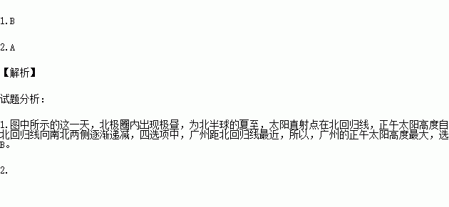 1.在图中所示的这一天,下列地点中正午太阳高度最大的是 ( )。