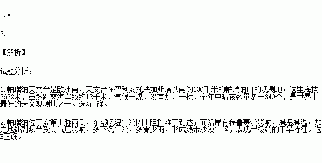欧洲南方天文台是欧洲天文学家合作的国际性机构。其主要观测设施建在智利,其中帕瑞纳天文台位于帕瑞纳山的顶部,海拔2635米,拥有完美的天文观测条件。读图完成下题。