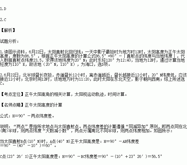 1.北京时间6月22日12:40时,丙同学观察到自己的影子最短。此时,甲与乙测得的度数为86.5°,该地最可能是