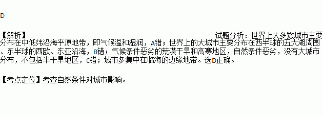 A. 世界上大多数城市的分布与气温有关,与降水关系不大